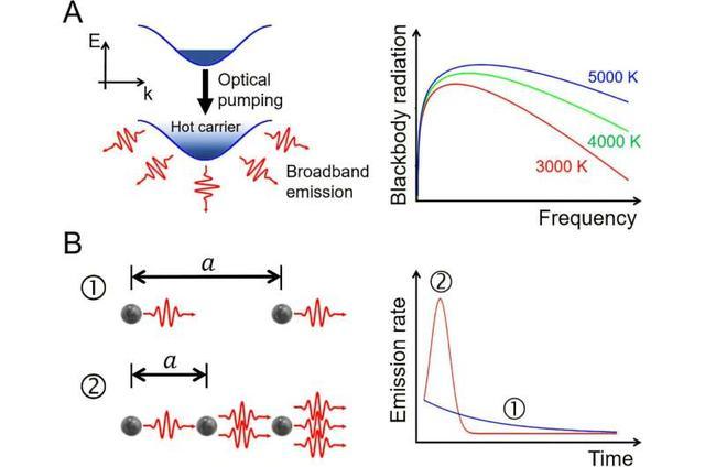 图释:相关电子系统中的发光过程。(A)由电子-电子散射产生的热载流子产生的宽带发射,已知在有效温度下模拟黑体辐射(注意对数尺度的示意图)。(B) 由于原子在原子间距离极短的极限内集体去激发,即→ 0,导致独立原子(记作(1))和迪克超辐射(记作(2))自发发射(注意,显示中a相对于波长刻意表示更长)。图片来源:Advanced Science(2026年)。DOI: 10.1002/advs.202522729