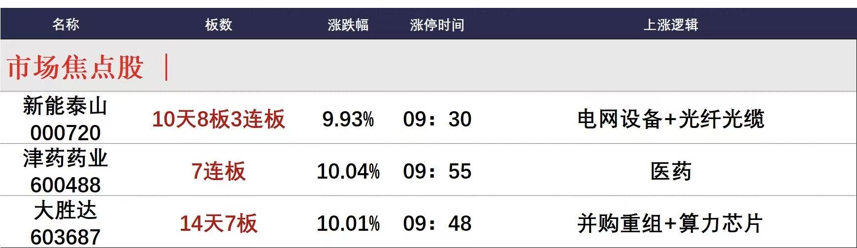今日午盘全市场共66股涨停,连板股总数6只,29股封板未遂,封板率为69%(不含ST股、退市股)。焦点股方面,光纤概念股新能泰山10天8板,医药板块津药药业7连板,算力芯片概念股大胜达14天7板。