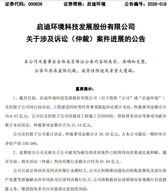 4月10日,启迪环境发布公告,公司及控股子公司累计诉讼、仲裁事项金额合计38.20亿元,占公司最近一期经审计净资产的159.08%,相关案件目前尚在审理或调解谈判过程中。其中,启迪环境方面作为被告的金额为31.5亿元。