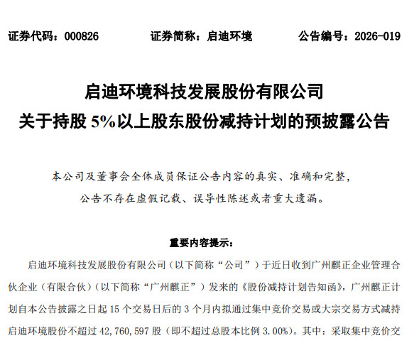 4月14日晚,启迪环境(000826.SZ)公告称,公司第一大股东广州麒正,计划自公告披露之日起15个交易日后的3个月内,拟通过集中竞价交易或大宗交易方式减持启迪环境股份不超过约4276万股,即不超过公司总股本的3%。